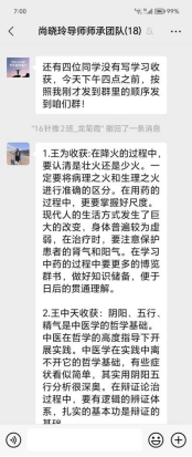 将师承同学分成两个小组,每周日跟尚晓玲导师随诊,尚老师常常告诫同学们要“读经典,跟名师,早临床”,将自己多年的经验毫无保留地传授给员工,使员工在临床实践过程中既开阔了眼界,又增长了知识,更增加了对中医药的热爱,同时要求同学及时整理和总结跟师学习心得体会。